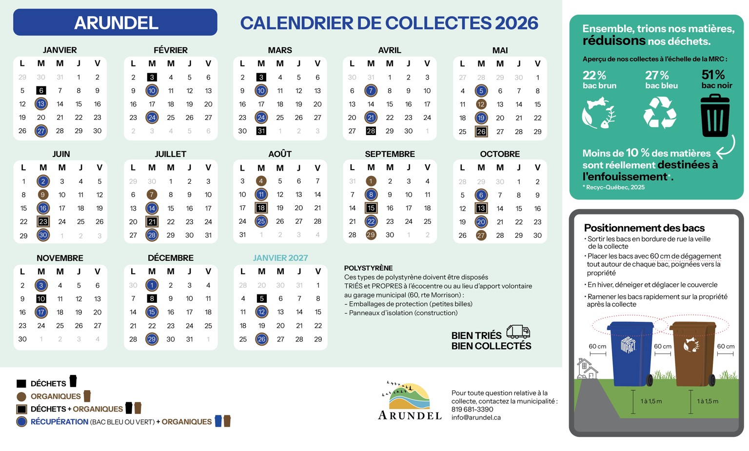 Arundel Changer de municipalité ——- ——- Changer Visiter le site de la municipalité Prochaines collectes Téléchargez le calendrier 2026 en format PDF L'écocentre le plus prèsÉcocentre d’Huberdeau110, chemin de la Rouge819 681-3377, poste 5703 Heures d'ouverture Huberdeau Du 2 mai au 28 novembre Samedi 8 h à 14 h Fermé les jours fériés Écocentre 110 Chemin de la Rouge, Boileau, QC J0T 1G0, Canada Galerie de photos