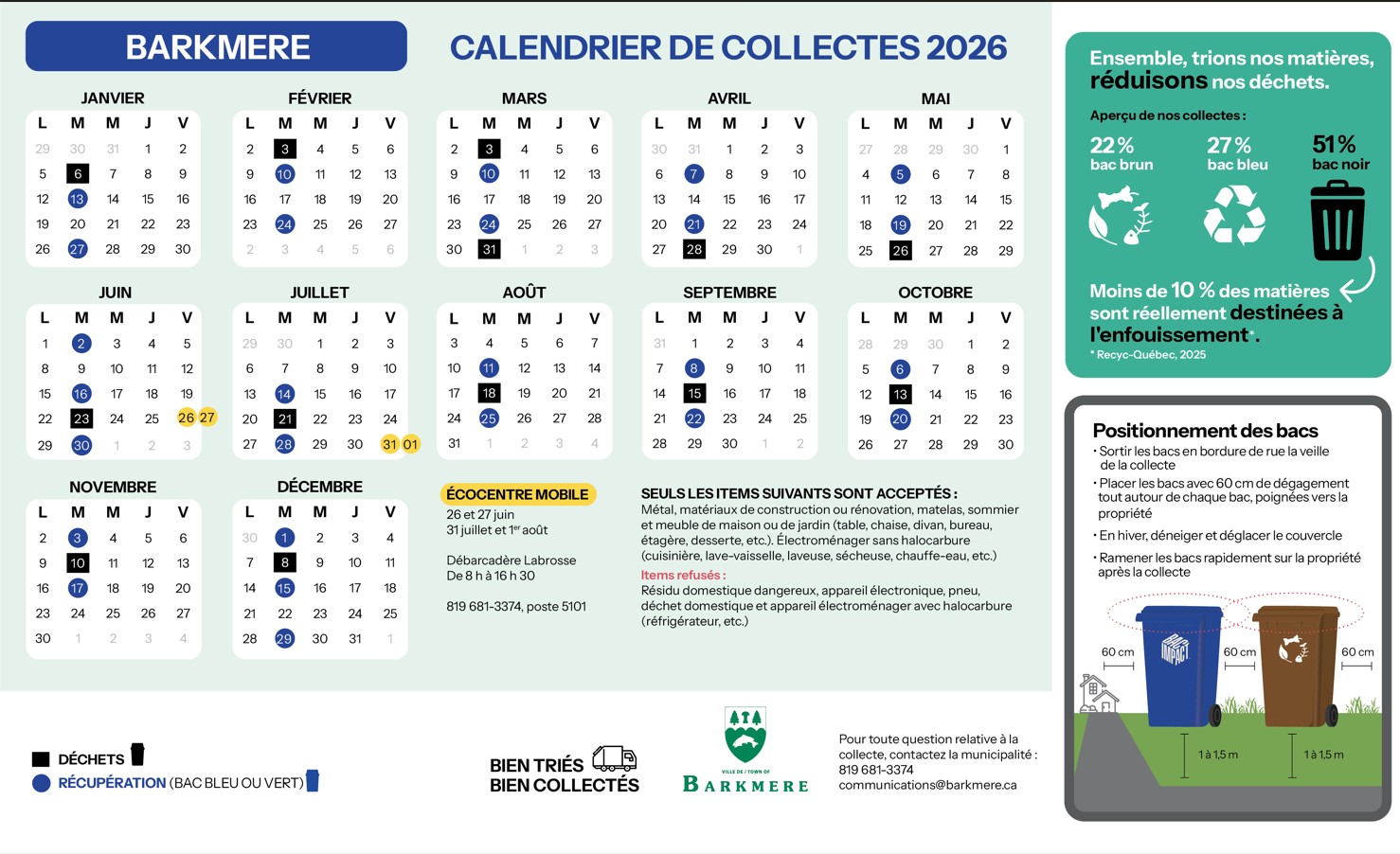 Barkmere Changer de municipalité ——- ——- Changer Visiter le site de la municipalité Prochaines collectes Téléchargez le calendrier 2026 en format PDF L'écocentre le plus prèsÉcocentre d’Huberdeau110, chemin de la Rouge819 681-3377, poste 5703 Heures d'ouverture Huberdeau Du 2 mai au 28 novembre Samedi 8 h à 14 h Fermé les jours fériés Écocentre 110 Chemin de la Rouge, Boileau, QC J0T 1G0, Canada Galerie de photos