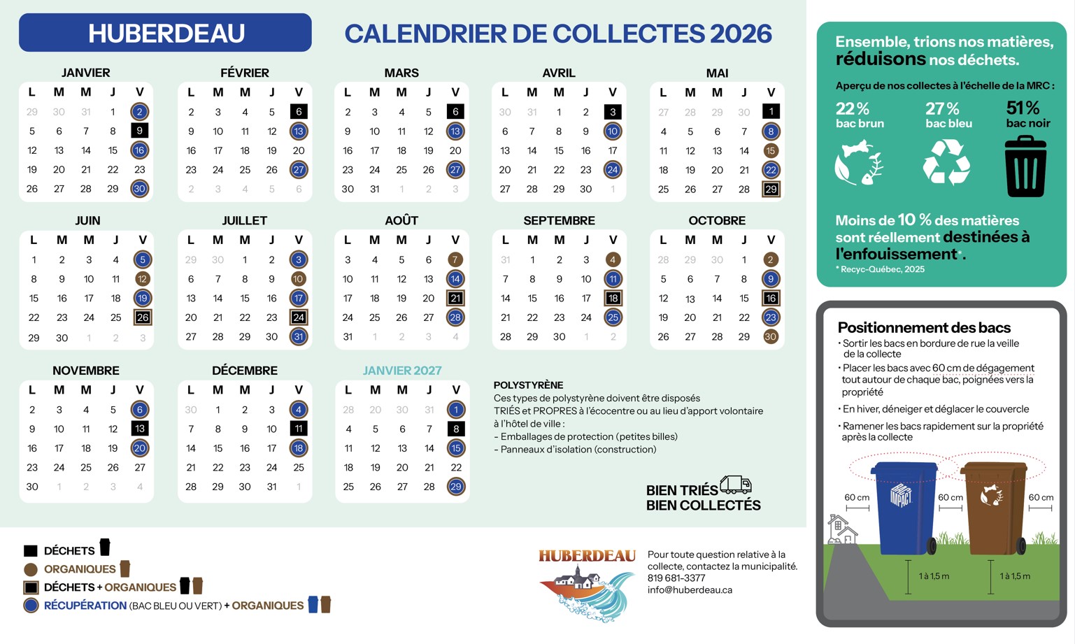 Huberdeau Changer de municipalité ——- ——- Changer Visiter le site de la municipalité Prochaines collectes Téléchargez le calendrier 2026 en format pdf L'écocentre le plus près Écocentre Huberdeau 110, chemin de la Rouge Huberdeau (819) 681-3377 poste 5703 Heures d'ouverture Huberdeau 110, chemin de la Rouge819 681-3377, poste 5703 Du 2 mai au 28 novembre Samedi 8 h à 14 h Fermé les jours fériés Écocentre 110 Chemin de la Rouge, Boileau, QC J0T 1G0, Canada Galerie de photos